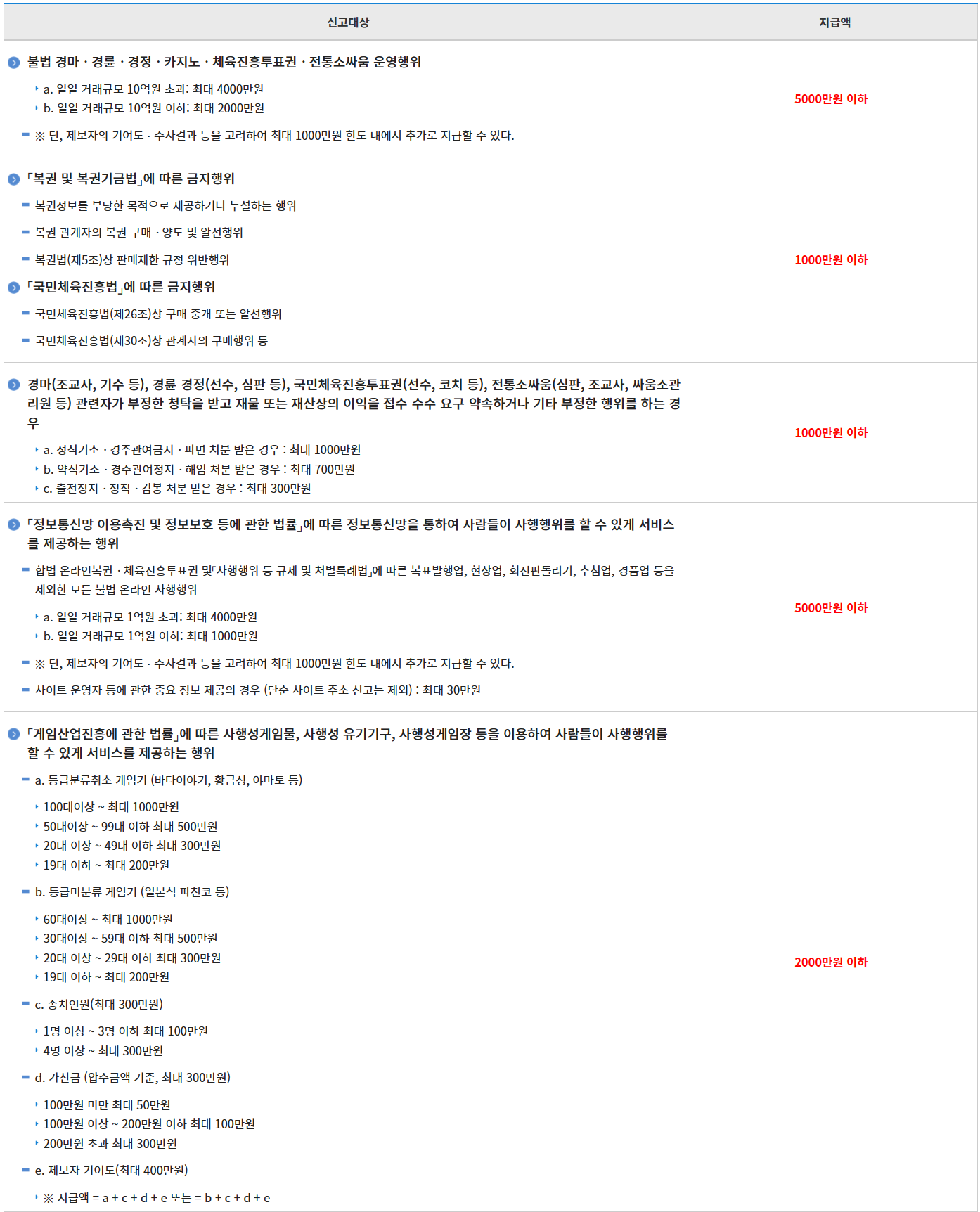 ※ 신고대상 포상금 지급기준