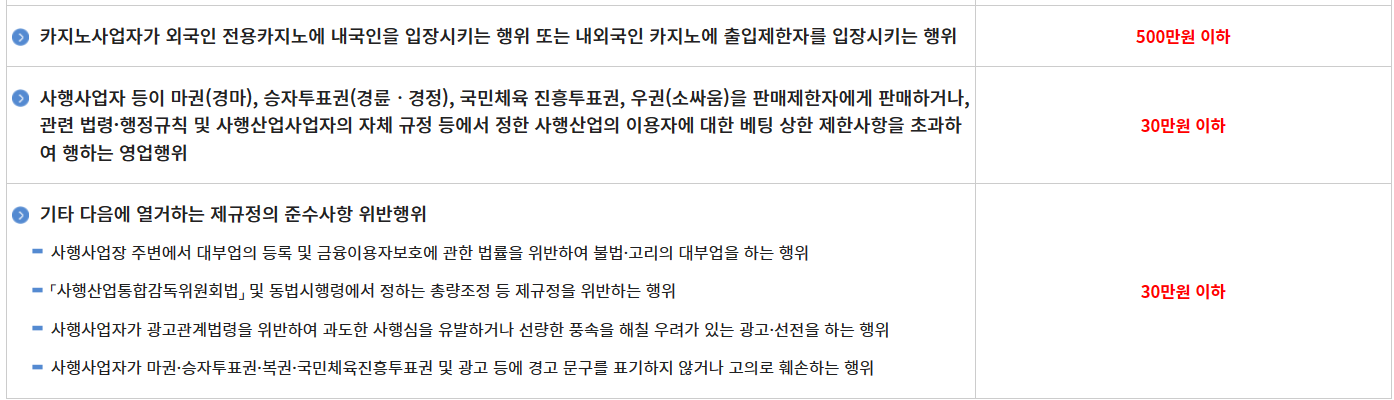 | 불법 경륜ㆍ경정 | 불법 경륜ㆍ경정은 국민체륙진흥공단이 아닌 자가 운영하는 싸이클ㆍ모터보트의 경주에 대해 배팅하는 사이트 및 그 운영자에 관한 정보 등이 신고대상에 해당 |