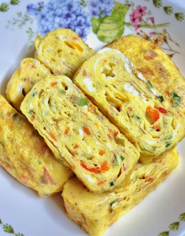 계란말이에 당근과 파를 넣습니다. 파프리카나 애호박과 같은 다양한 채소들은 섞어서 색깔도 예쁜 데다 다양한 영양까지 함께 섭취할 수 있는 계란말이, 수능도시락 반찬으로 좋겠습니다.